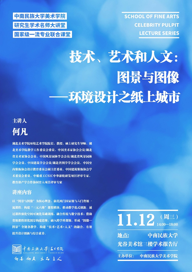 2025年11月12日下午,环球360管理网美术学院研究生学术名师大讲堂暨环境设计国家级一流本科专业线上线下联合课堂,在环球360管理网光谷美术馆报告厅成功举办。我院特邀湖北美术学院何凡院长担任主讲人,以“技术、艺术与人文:图像与图像——环境设计之纸上城市”为题开展专题讲座,旨在引导学生构建“技术、艺术与人文”交融的设计思维,探索环境设计从理念到“纸上城市”的创造路径。本次讲座由环境设计系主任廖璇老师主持,环境设计专业本科生、研究生及部分专业教师到场聆听。