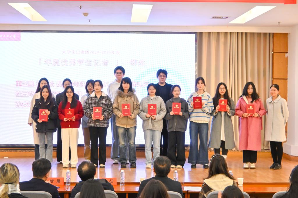 党委宣传部副部长杨征宣读了表彰名单,与会领导老师分别为年度优秀学生记者、优秀记者团干部、优秀网评员、优秀作品获得者及优秀部门代表颁奖。