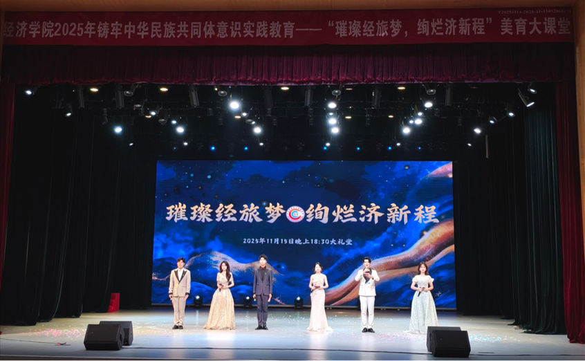 为深入推进铸牢中华民族共同体意识实践教育,深化思政教育与艺术实践的深度融合,培养德智体美劳全面发展的社会主义建设者和接班人,11月15日晚,经济学院在学校大礼堂隆重举办2025年铸牢中华民族共同体意识实践教育——“璀璨经旅梦 绚烂济新程”美育大课堂。经济学院在校领导、辅导员、班导师代表、各年级学子齐聚一堂,共同见证这场以美育人、以文化人、以情聚心的精神盛会。