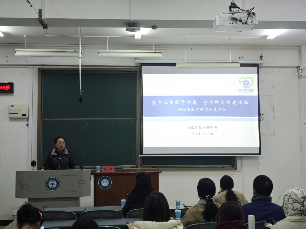 讲座中,李颖主任系统梳理了我国医疗保障制度的发展脉络,从计划经济时期的劳保医疗、公费医疗,到改革开放后适应社会主义市场经济体制的医保制度改革,再到新时代多层次医保体系的构建。她重点解读了湖北省"1+4+2"医保改革框架,即建设多层次医保制度这一总体目标,健全待遇保障、筹资运行、医保支付、基金监管四个机制,完善医药服务供给与医保公共服务两个支撑。