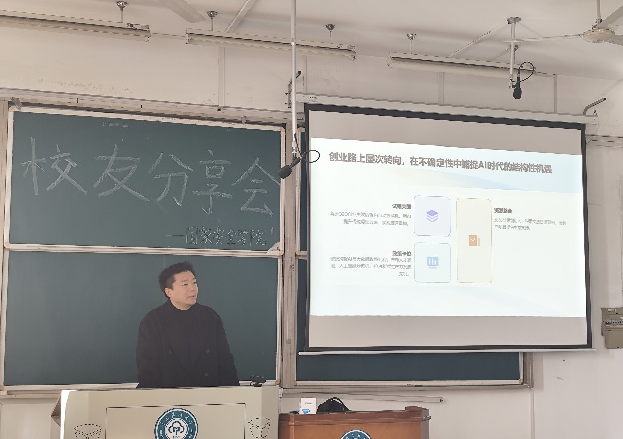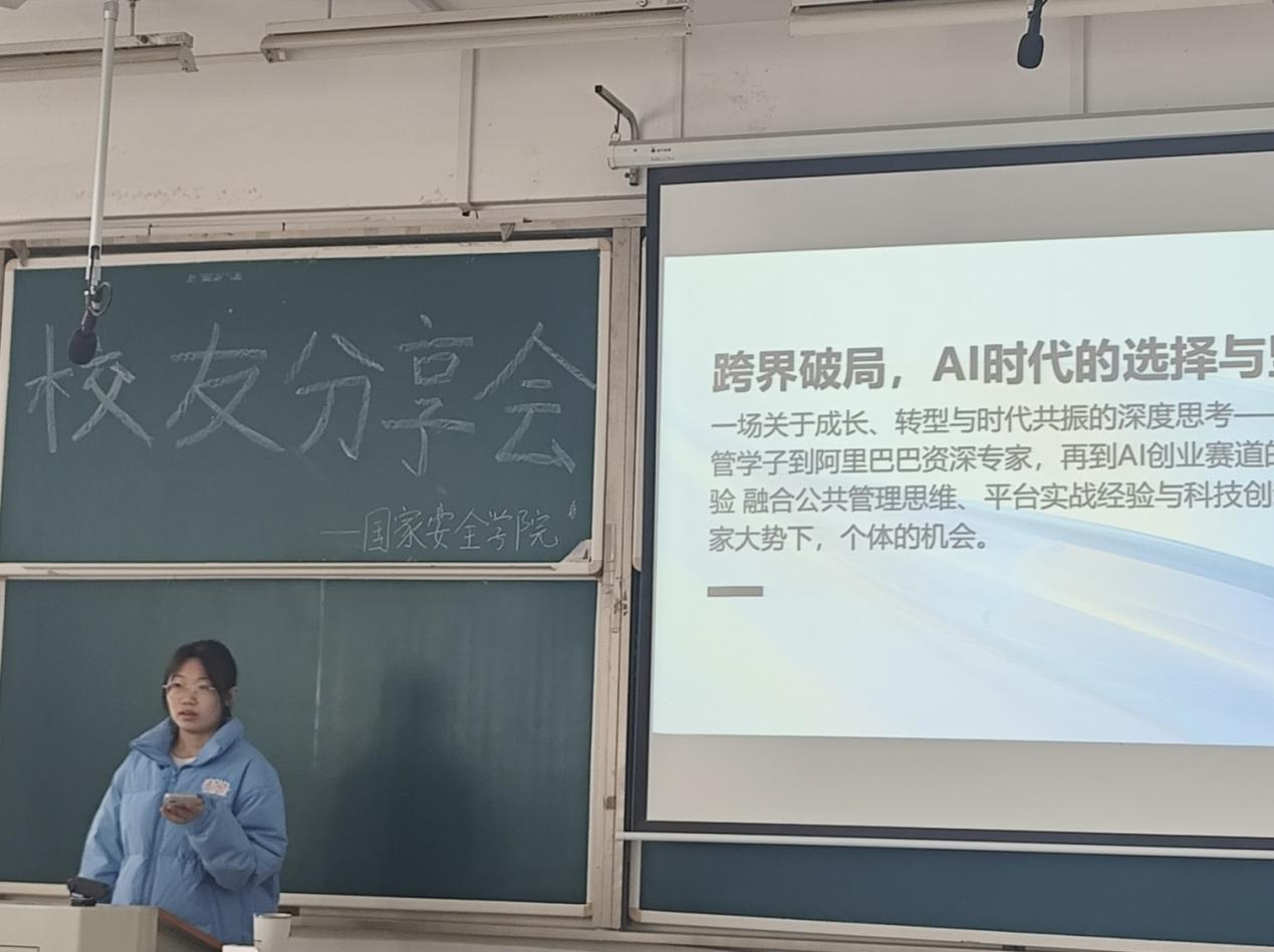 2025年11月24日,国家安全学院校友联络社主办的“AI时代,大学生的机会与挑战”主题分享会顺利开展。2011级公共管理专业优秀校友、杭州智百味科技有限公司创始人兼CEO潘志强重返校园,以“跨界破局,AI时代的坚守与突围”为核心,分享其从公管学子到阿里资深专家、再到AI创业者的十年实战历程,为在校学子送上兼具深度与实操性的成长指南。本次分享会搭建了校友与在校学子的沟通桥梁,让大家在AI浪潮下明晰发展方向,收获颇丰。