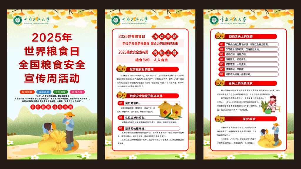 2025年10月16日(第45个“世界粮食日”)至22日是全国粮食安全宣传周,我校后勤保障处饮食服务中心以“粮食节约 人人有责”为主题,在各食堂同步启动系列宣传与实践活动,积极呼应全国“手拉手共倡多样美食,聚合力同创美好未来”的宣传周主题,全力营造“珍惜粮食、杜绝浪费”的文明氛围。