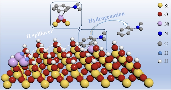 氢溢流是多相催化加氢中的一种独特效应,通过活性氢从金属向载体迁移,可有效降低加氢反应的活化能垒,从而提高催化加氢反应效率。该研究通过层状硅酸盐还原热解制得Ni纳米颗粒均匀分散的Ni/SiO2催化剂,该催化剂金属Ni掺入载体SiO2基质中,使得载体表面存在丰富的配位不饱和Ni2+位点(Lewis酸位点)和Si-OH基团(Brønsted酸位点)。前者通过吸附不饱和底物分子为氢迁移提供势能;后者为氢迁移提供介质,二者与Ni纳米颗粒协同促进非还原性SiO2载体与Ni纳米颗粒间的氢溢流,实现温和条件下(80-120 °C,H2 10 bar)高效加氢还原烷基苯、(N-取代)苯胺、苯酚和烷氧基取代苯酚等>98种(杂)芳环。