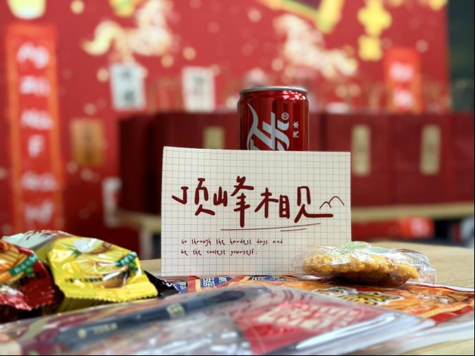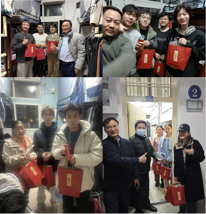 当晚八点,班导师们、师生党员们分组前往学生宿舍楼。这份礼包兼顾实用与心意:文具套装为考试保驾护航,暖宝宝驱散冬日寒意,定制可乐印着“一‘研’为定”“终将上岸”等专属祝福,薯愿、士力架暗藏“薯你最棒”“能量满满”的寓意,“一举夺魁”钥匙扣则承载着金榜题名的美好祝愿。