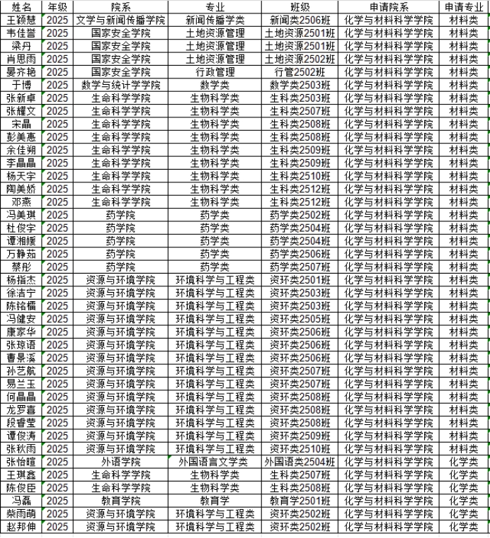 '; } else{ document.getElementById(PLTS[cur1].portletId).innerHTML=response; } } catch(e){} var regx=new RegExp(']*?>([\\s\\S]*?)<\\/scr'+'ipt\\s*>|]*?\\/>','img'); var arr; while((arr = regx.exec(response)) != null){ if(arr.length){ if(arr.length >=2){ var regx2 = new RegExp("]*?\\bsrc=\\s*('[^>]*'|\"[^>]*\"|[\\S]*)\\s*\\/?>",'im'); var srcArr=regx2.exec(arr[0]); if(srcArr!=null){ var src= srcArr[1]; if(src){ if((src.charAt(0)=='"') || (src.charAt(0)=="'")){ src=src.substr(1,src.length-2); } loadScript(src); } } else{ execJavaScript(arr[1]); } } } } } cur1++; loadps(); } } function loadScript(s){ try{ var sc=document.createElement('script'); sc.type='text/javascript'; sc.language='javascript'; sc.src=s; document.body.appendChild(sc); }catch(e){} } function execJavaScript(s){ try{ var sc=document.createElement('script'); sc.type='text/javascript'; sc.language='javascript'; sc.text=s; document.body.appendChild(sc); }catch(e){} } window.onload=loadps; 化学与材料科学学院关于组织2024级、2025级普通全日制本科生转专业面试工作的通知 化学与材料科学学院关于组织2024级、2025级普通全日制本科生转专业面试工作的通知 发布时间:2025-11-18 浏览次数: 各位拟转入化材学院的学生: 请携带校园卡或者学生证、高考单科化学成绩60分以上(百分制)或者高考理综60分以上(百分制)相关证明材料,准时参加化材学院转专业面试。 一、面试内容为综合素质考察 二、面试对象:符合本院转专业细则要求的学生 三、面试具体安排如下: 时间:2025年11月20日(第十一周周四)下午两点 地点:7号楼111化材院小会议室 四、面试名单: 请申请转入我院的同学按时参加面试,请面试同学提前15分钟到达7号楼109大会议室候场抽签,面试成绩低于80分(满分100分)的直接不予录取。逾期不到者视为自动放弃,综合素质测评成绩记0分,不予录取。 化学与材料科学学院 2025年11年20