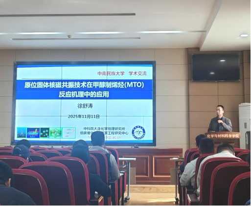 2025年11月11日上午,中国科学院大连化学物理研究所徐舒涛研究员应邀莅临我院,并在化学与材料科学学院学术报告厅举行题为“原位固体核磁共振技术在甲醇制烯烃 (MTO) 反应机理中的应用”学术讲座。本次报告由化学与材料科学学院副院长王立教授主持,我院教师及研究生参加。