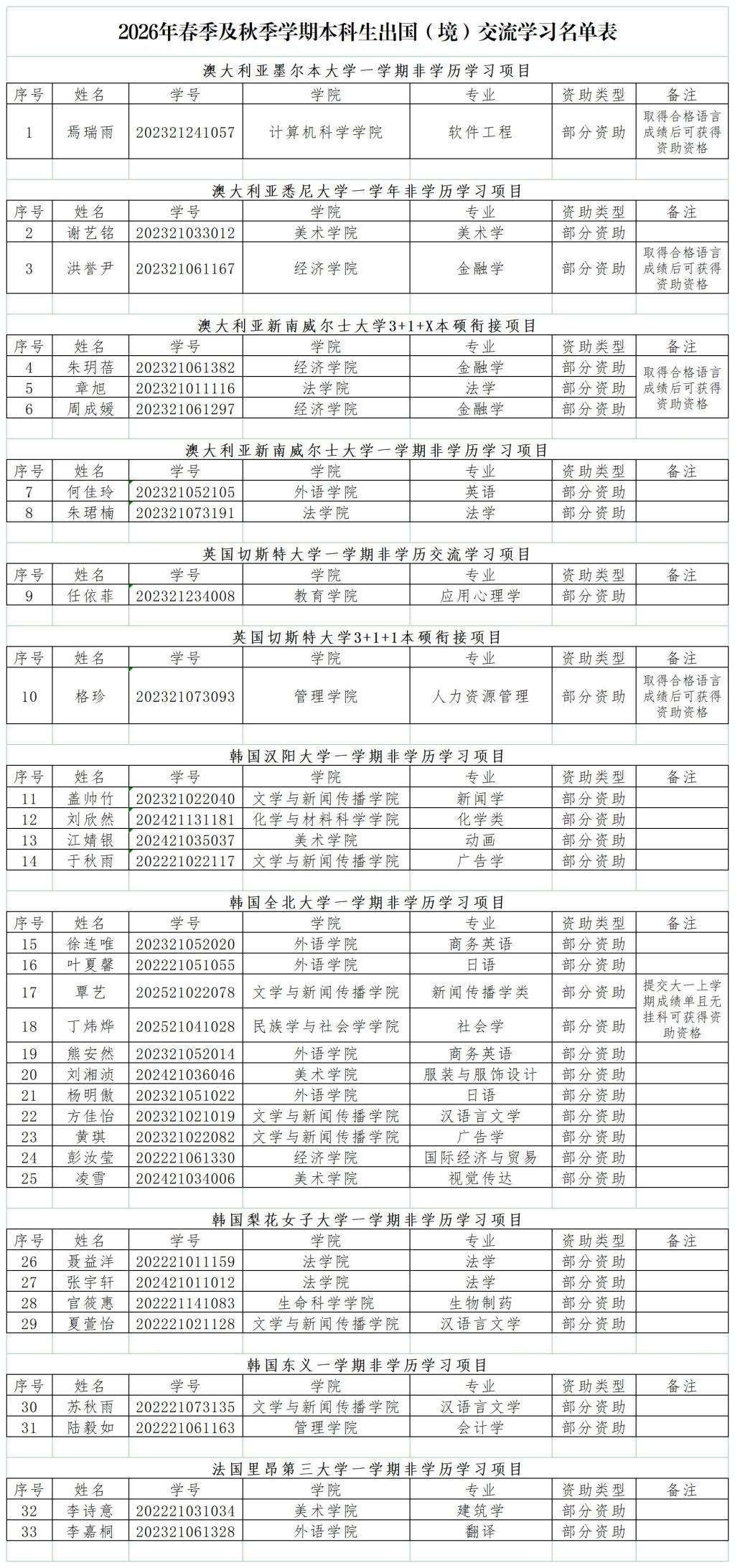 经学生申请,学院审核推荐,外方学校审核,学校评审工作小组评审,学校拟选派焉瑞雨等33名本科生于2026年春季及秋季学期赴澳大利亚墨尔本大学/悉尼大学/新南威尔士大学、英国切斯特大学、韩国汉阳大学、法国里昂第三大学等9所国外合作院校交流学习。现对评审结果予以公示。