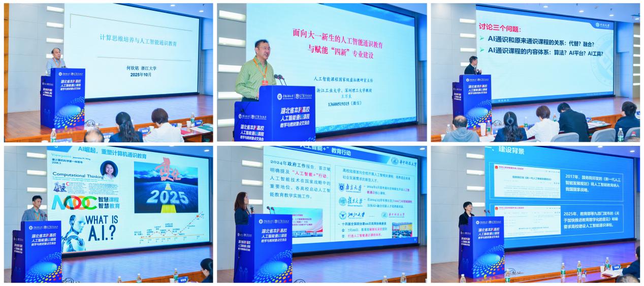 在专家报告环节,浙江大学何钦铭教授以“问题求解”为核心,阐述了人工智能通识课程与计算思维融合的设计思路。浙江工业大学王万良教授探讨了面向大一新生的AI通识教育如何有效赋能“四新”建设。中南大学刘卫国教授提出了多种内容体系,并将课程按专业需求分为工具型、平台型与程序型三类。武汉理工大学赵广辉教授指出,计算机通识教育需转向培养学生“AI协作解决复杂问题”的能力。华中科技大学黄晓涛教授深入阐释了“AI-ABC”教学理念,通过系统性重构教学内容与资源,破解当前AI通识教育中存在的知行脱节、资源繁杂与伦理忽视等核心难题。我校莫海芳老师则分享了我校的校本实践,介绍了通过标准化框架与校企协同推进课程建设的方案。