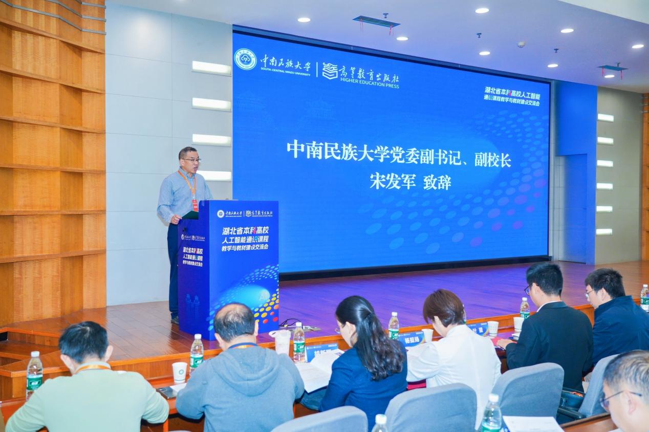 我校党委副书记、副校长宋发军,本科生院院长胡军浩出席开幕式并致辞,计算机学院(人工智能学院)院长帖军主持开幕式。宋发军对与会嘉宾表示热烈欢迎,并介绍了我校在人工智能领域的系统布局,表示学校将持续探索AI赋能高质量人才培养的新路径。胡军浩在致辞中介绍了学校在人工智能通识教育方面的改革成果。他表示,下一步,本科生院将继续着力构建“分层分类、交叉融合”的课程体系,推动教材与数字资源建设。湖北省高等教育学会副秘书长彭卫和高等教育出版社工科事业部副主任缪可可先后致辞。彭卫肯定了各高校在人工智能通识教育方面的实践成果,并表示学会将继续发挥桥梁纽带作用,优化合作交流平台。缪可可3着重介绍了高等教育出版社在人工智能教材与数字资源建设方面的规划与支撑作用。