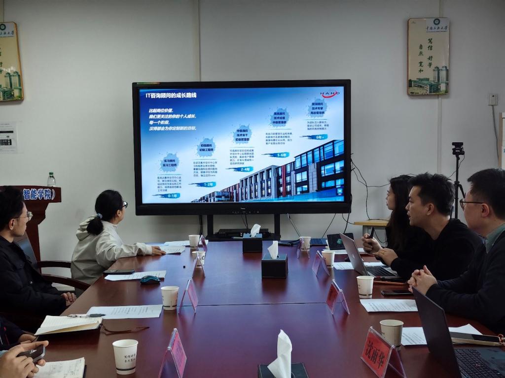 上海汉得代表随后依次发言:供应链数智化事业部 HRBP 张牧介绍公司在供应链数智化转型、AI 赋能产业升级等领域的业务布局与行业优势,明确本次来访团队围绕校企合作模式、人才供需对接开展沟通的核心职责;校招部高级经理沈雨华则聚焦 2026 届校园招聘计划,说明公司将重点面向学院相关专业招聘软件开发、系统实施、技术支持等岗位,配套 “导师带教 + 项目实战” 的新人培养机制,期待吸纳具备扎实专业功底与实践意识的毕业生。
