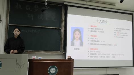 第三位分享的张雯果学姐聚焦于“知行合一——教育实习实践中的得与失”。她结合在武汉市江夏区五里界小学和鄂州市鄂城区武昌学院的实习经历,生动讲述了如何将教育理论应用于实践,并在实践中反思、成长。关于如何在保研中凸显实习价值,她给出了三点建议:精心准备申请资料、有针对性地投递目标院校、以及善于将感性经验提升为理性思维以凸显个人优势。她特别强调了坚持记录、系统总结、保持问题意识与逻辑思维的重要性,并指出教育工作者需要在教育理论的“应然”与教育实践的“实然”之间寻找平衡,在不断重构中对教育形成更深刻的认知。