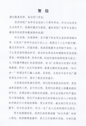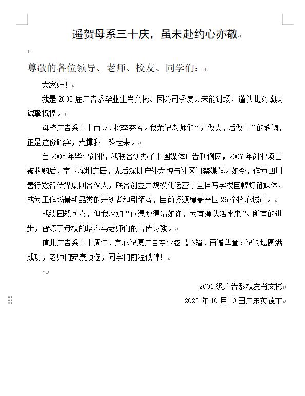 虽不能至,心向往之。在庆典筹备期间,多位校友虽身处四方,仍以贺信传递深情。01级肖文彬、03级涂锦涛、04级段广宏等校友,纷纷以书信形式,向文学与新闻传播学院的师生及校友致以热烈祝贺与诚挚祝福,字里行间尽显对母校的眷念与对专业发展的热切关注。