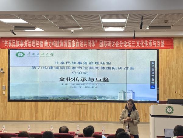 本站讯(通讯员:周依琳 摄影:周依琳)10月15日下午,“共享民族事务治理经验 助力构建澜湄国家命运共同体”国际研讨会分论坛三“文化传承与互鉴”在文一楼101会议室举行,本次分论坛由文学与新闻传播学语和外国语学院两院联合承办。论坛上半场由文学与新闻传播学院硕士生导师杜颖卉主持,文学与新闻传播学院副院长、博士生导师陈峻俊教授担任评议嘉宾。论坛下半场由外国语学院副院长、硕士生导师李明副教授主持,外国语学院副院长、硕士生导师李敏杰教授担任点评嘉宾。