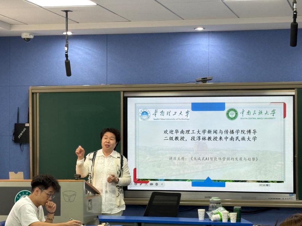 讲座之后,黄教授对段教授的分享进行总结。他表示,段教授的本次讲座内容极具前沿性,是广告产业和营销产业的最新领域。讲座有扎实的理论支撑,通过众多产业案例帮助同学们深刻理解当前人工智能体对广告营销的影响,特别是关于人工智能体营销五个发展趋势的观点富有创新性。段教授的讲座对于同学们学术研究选题方向和研究方法具有指导意义。