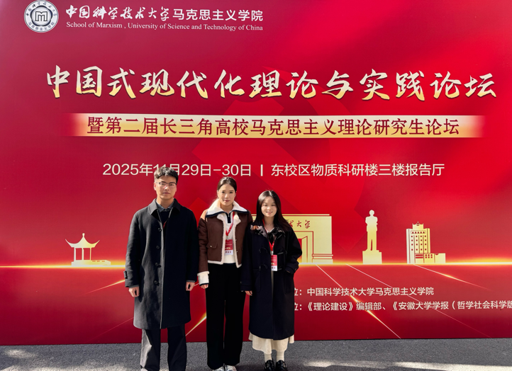 11月29日至30日,由中国科学技术大学马克思主义学院主办的“中国式现代化理论与实践论坛暨第二届长三角高校马克思主义理论研究生论坛”在合肥举行。来自长三角等地区的多所高校的马克思主义理论学科的专家学者、青年教师及研究生齐聚一堂,围绕中国式现代化相关理论与实践问题展开深入研讨交流。我院马克思主义发展史专业研究生闫跃远、周泓麟和马克思主义中国化研究专业研究生范亚丽在论坛中表现亮眼,凭借扎实的学术功底和深刻的研究见解获得佳绩。