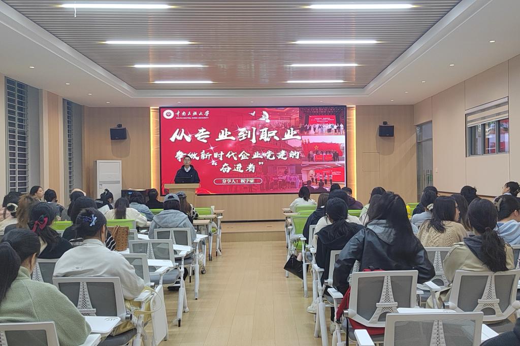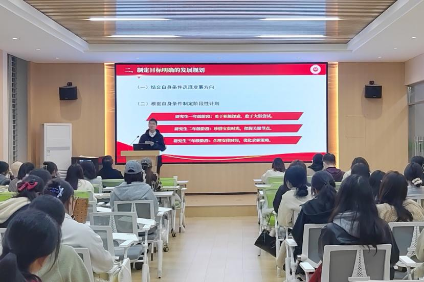 报告中,祝宇豪回顾了自己在我院读书学习时的经历,重点介绍了振华重工的企业文化,并围绕“如何成为新时代企业党建奋进者”,结合自身经历,从“识局、明志、精技、实战”四个维度展开交流:一是“识局”,厘清央企国企区别与党建工作重要性。他分享了习近平总书记关于国有企业党的建设重要论述的学习体会,指出党务岗位既是政治责任,也是复合型人才成长的快车道。二是“明志”,制定“战略+战术”双层级成长路线。他建议研一时要勇于试错,在科研、学生工作与竞赛中定位自我;研二时要定向蓄力,尽早确定论文选题并积累可迁移能力;研三时要双线推进,统筹论文写作与求职准备,努力实现高质量毕业与就业。三是“精技”,锤炼“能说、能写、能干”的硬核本领。他对照企业党群、宣传、人事等八大岗位模块,拆解校园中可复制的训练场景,鼓励大家将每次学生工作历练视为岗位预演,不断提升实战能力。四是“实战”,把握“秋招+春招”双线求职策略。他从网申技巧、简历撰写、考公考编备考,到面试准备与岗前实习等全流程环节,提醒学弟学妹善于整合资源,实现高效求职。