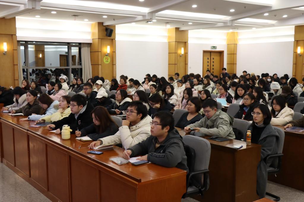 钱文彬以“深学笃行党的二十届四中全会精神,在中国式现代化征程中勇担青春使命”为题,从国内外形势、发展基础与挑战机遇等方面进行了深入分析,并系统阐释了“十五五”规划的指导方针、总体目标、根本准则及重点战略任务。他指出,“十五五”时期将更加突出以推动高质量发展为主题,着力提升科技自立自强能力,持续完善制度机制,以党的全面领导和民主法治建设为根本保障,为实现规划目标提供坚强政治支撑。他强调,“十五五”规划在我国推进中国式现代化的总体布局中承上启下、意义重大。青年学生要坚持以党的二十届四中全会精神为指引,把握时代大势、练就过硬本领、主动担当作为,自觉将学习成果转化为服务学院转型升级高质量发展、服务学校“双一流”建设的实际行动,以青春之力汇入强国建设、民族复兴的磅礴伟力。