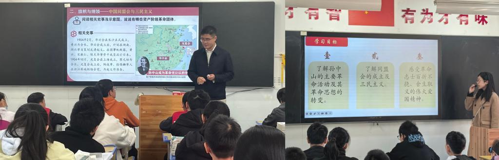10月23日,经过充分准备后的段海容、黄誉东两位同学先后登上旭光中学讲台为中学生们讲授了《部编版历史教材》八年级上第三单元第八课《中国同盟会》,其余同学则随堂认真观摩。课后,姚黎与陶亚莉老师对两位同学的授课进行点评。老师们既充分肯定了两位同学的表现:课件制作精美,仪表大方、谈吐得体,各教学环节过渡自然科学;也提出了中肯的指导意见,如:板书不可或缺的重要性,脱稿教学的必要性,丰富课堂师生互动的具体举措,意义类问题应引导学生自主思考而非单方面灌输,视频素材选取时应注意内容的精准性与权威性……