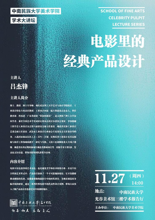 为推动设计学科交叉融合,探索科学研究与设计实践的创新路径,拓展学术视野,搭建跨界学习交流平台,美术学院于 11 月 27 日举办了 “电影里的经典产品设计” 专题讲座。本次活动特别邀请了武汉理工大学艺术与设计学院院长吕杰峰教授担任主讲人。讲座以电影为切入点,深入剖析其中经典产品设计的美学逻辑、文化内涵与实践价值,为师生奉献了一场既具学术深度又有实践价值的知识盛宴。本次讲座由学院副院长程超教授主持,这一活动彰显了学院在优化人才培养体系、提升师生学术研究能力方面的持续探索与务实举措。