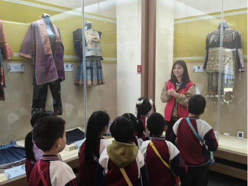 我馆讲解员精心设计了互动环节,引导孩子们在观察中思考。“为什么他们的衣服上有这么多银饰?”“白裤瑶这个名字是怎么得来的?”——面对孩子们的提问,讲解员深入浅出地解释其背后的原因并着重强调:正是这些各具特色的民族文化,共同汇成了中华文明奔流不息的长河。