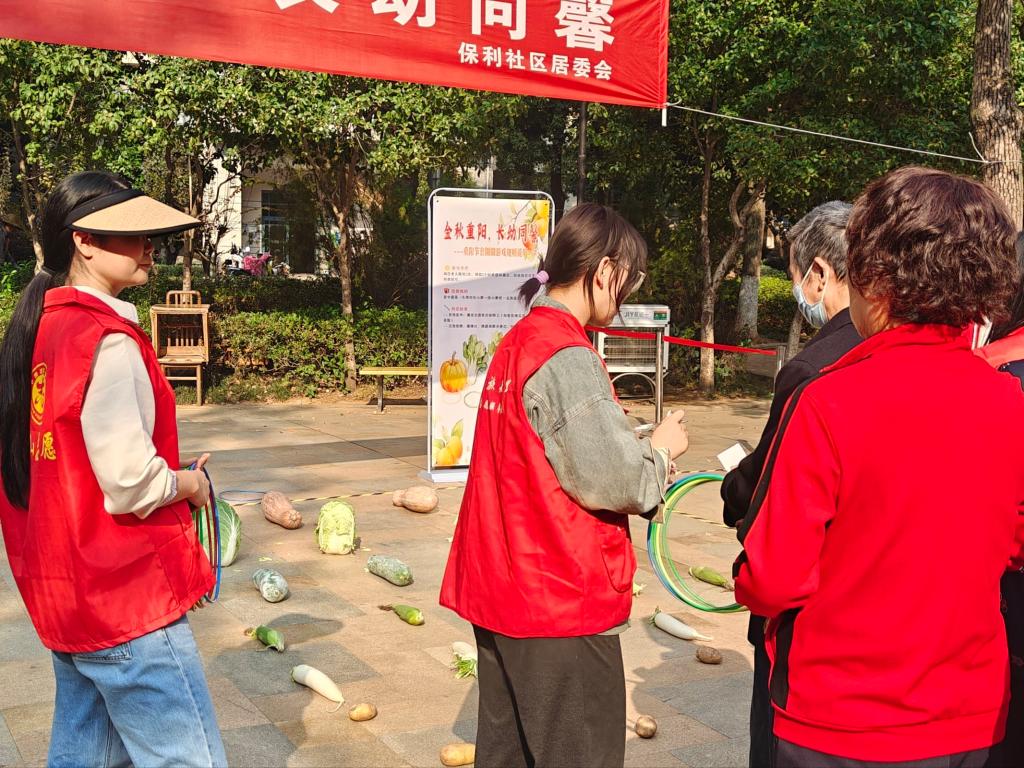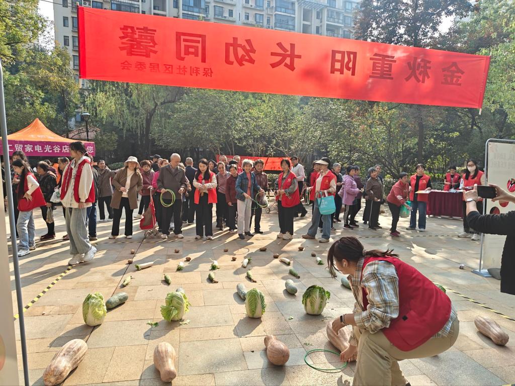 活动开展期间,志愿者们个个精神饱满。有负责蔬菜套圈圈区的志愿者,志愿者提前把新鲜蔬菜摆成整齐的方阵,耐心指导老人调整姿势。老年人们不断投掷着手上的套圈,眼中满是那“躺”在地上诱人的蔬菜。当圈稳稳套住青菜,志愿者立刻递上“战利品”,满是重阳的温情。