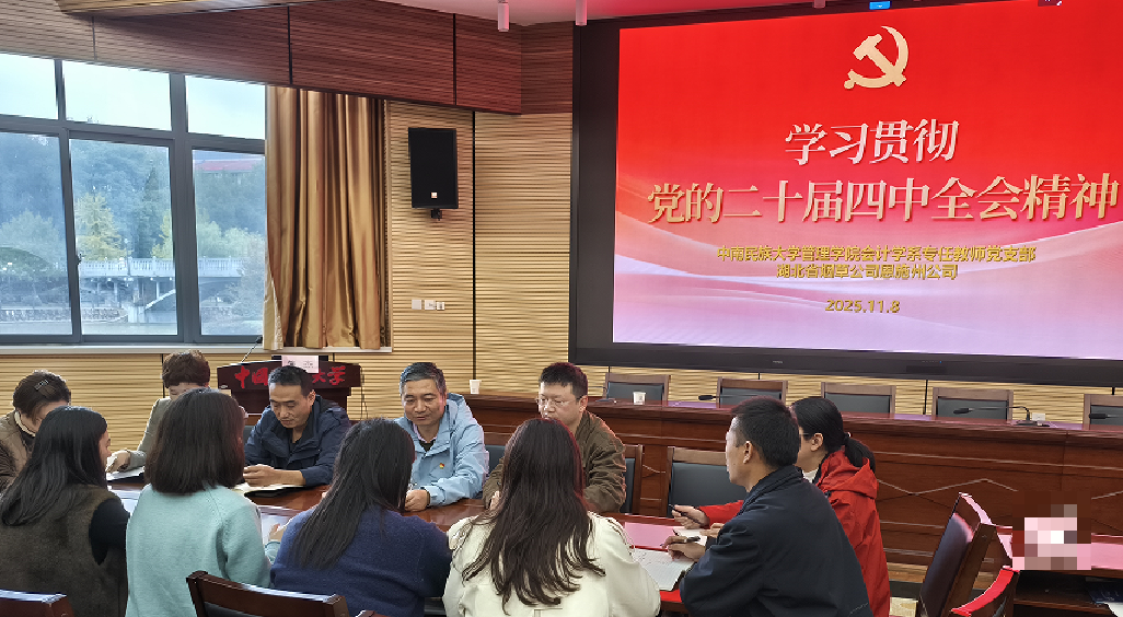 2025年11月8日,为学习贯彻党的二十届四中全会精神,会计学系专任教师党支部与湖北省烟草公司恩施州公司在中国地质大学(武汉)开展联学联建活动。湖北省“双带头人”教师党支部书记工作室负责人、会计学系专任教师党支部书记苏亚民、师生代表与湖北省烟草公司恩施州公司财务部门党员代表共15人参加了此次联学联建活动。