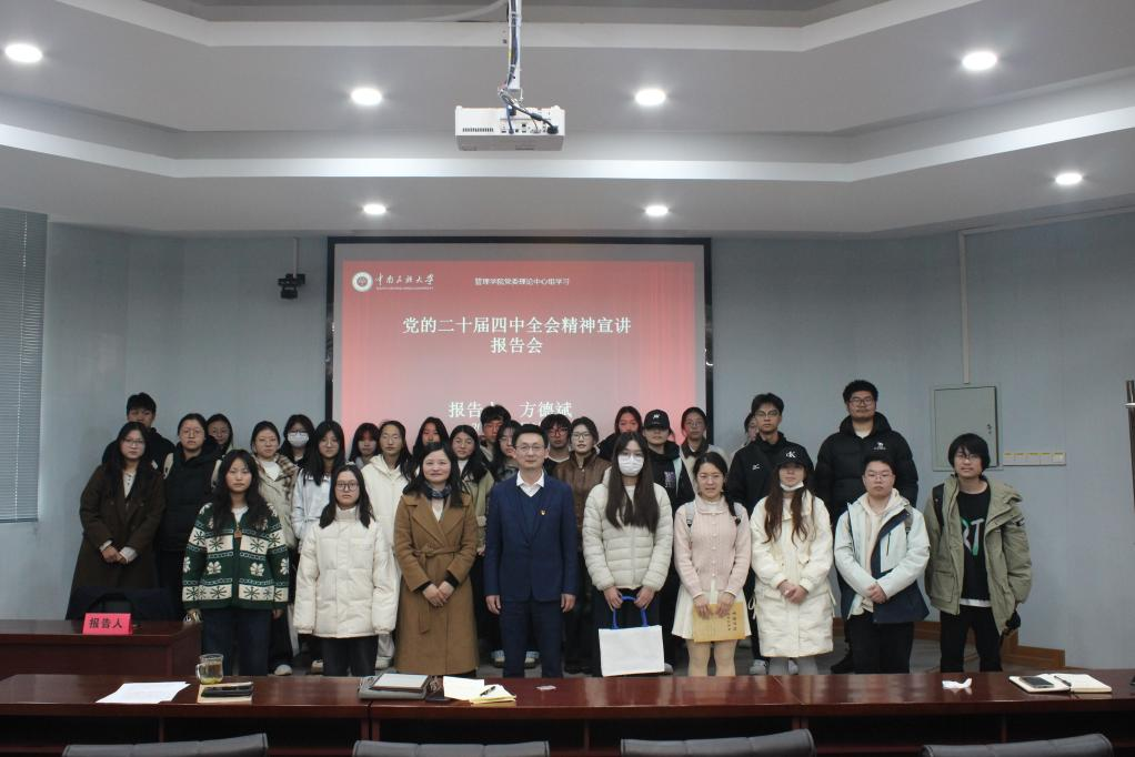 为深入学习贯彻党的二十届四中全会精神,切实把实现立德树人根本任务高质量发展与党中央战略部署紧密结合,根据校党委部署,12 月 9 日上午,管理学院邀请校党委常委、副校长方德斌作了题为《确保基本实现社会主义现代化取得决定性进展—学习贯彻党的二十届四中全会精神》的专题宣讲,管理学院全体教师和学生党员代表到会聆听。管理学院党委书记闻亮主持了报告会。