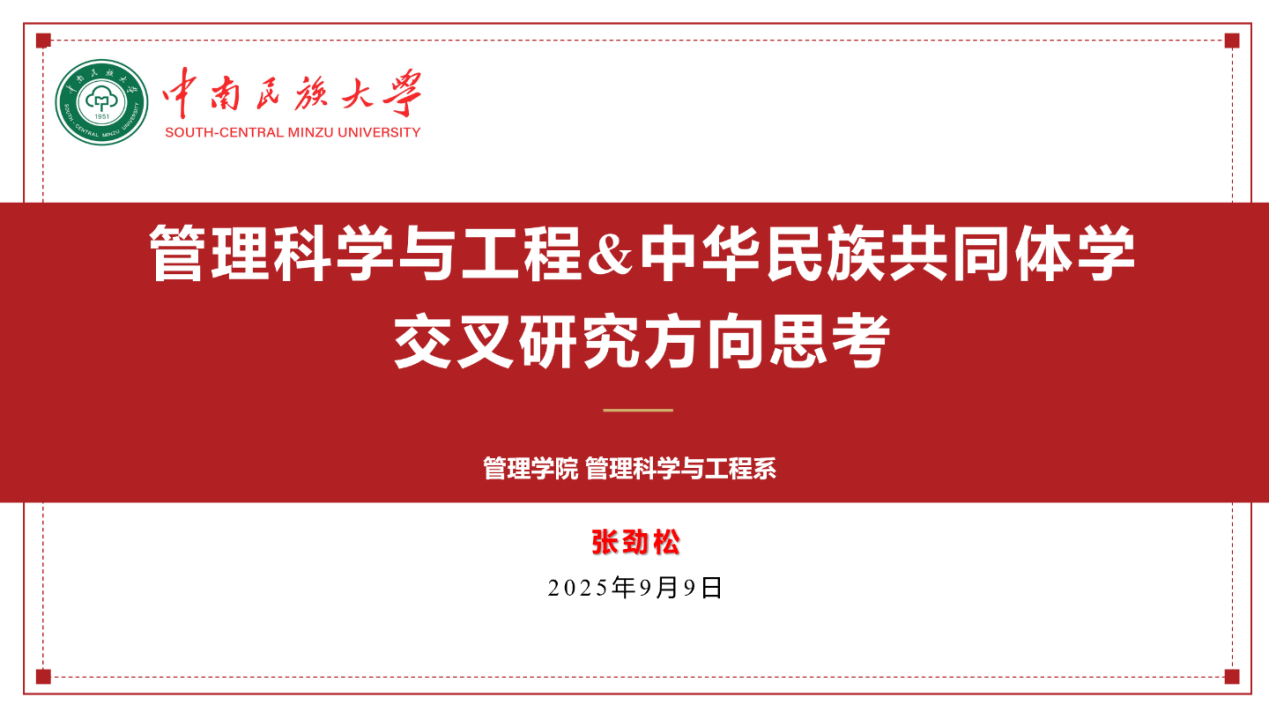 (文字:何东辰)近日,管理学院管理科学与工程系围绕“管理科学与工程&中华民族共同体学交叉研究方向”这一主题开展研讨与交流,旨在充分发挥管理科学与工程的学科优势,实现管理科学与工程和中华民族共同体学两个学科在理论与方法层面的深度融合,为管工学科发展建设注入新的活力。管理科学与工程系张劲松老师做《管理科学与工程&中华民族共同体学交叉研究方向思考》主题分享,管工系全体教师参加。