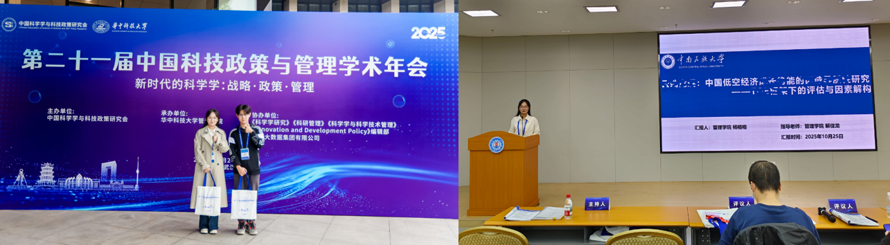 2025年10月24日至26日,第二十一届中国科技政策与管理学术年会在武汉东湖宾馆成功举行。本次会议主题为“新时代的科学学:战略·政策·管理”,由中国科学学与科技政策研究会主办,华中科技大学管理学院承办,是国内科技政策与管理领域的高水平学术盛会。本届年会汇集了来自全国科技政策与管理领域的知名学者和专家,会议设立了包括“区域科技创新与产业创新深度融合”在内的50个专题论坛,围绕数智科技、区域创新、人工智能治理等前沿议题开展了深入探讨。我院解佳龙副教授团队依托国家社会科学基金完成的阶段性研究成果入选本届年会,团队成员杨格格、王森等受邀进行现场交流汇报。