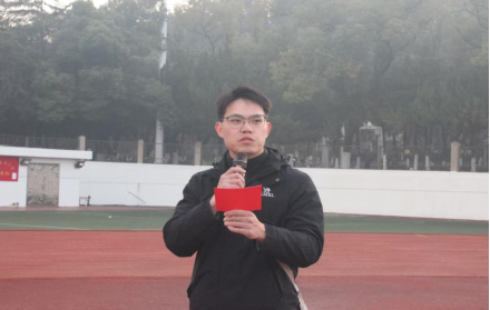 (图为管理学院团委指导老师何港主持升旗仪式,李佳雯摄)