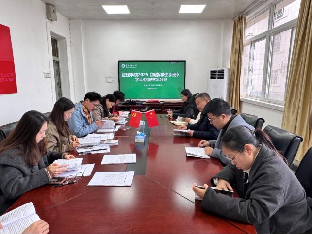 (管理学院学工办研读《新版学生手册》 谢鹏摄)