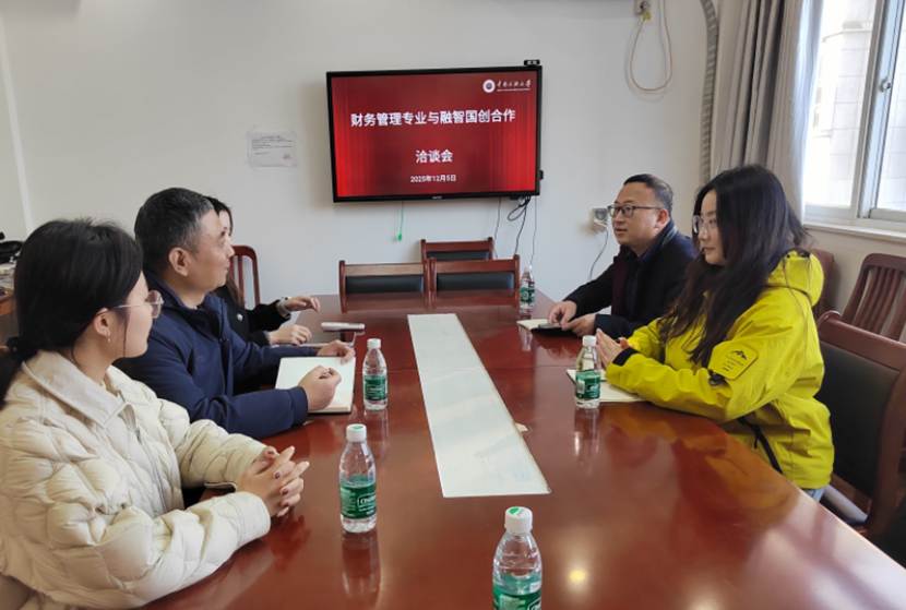 2025年12月5日,财务管理专业负责人苏亚民与来访的北京融智国创科技有限公司湖北区负责人郭总经理在5-319会议室洽谈深化产教融合事宜。财务管理专业师生代表参会。