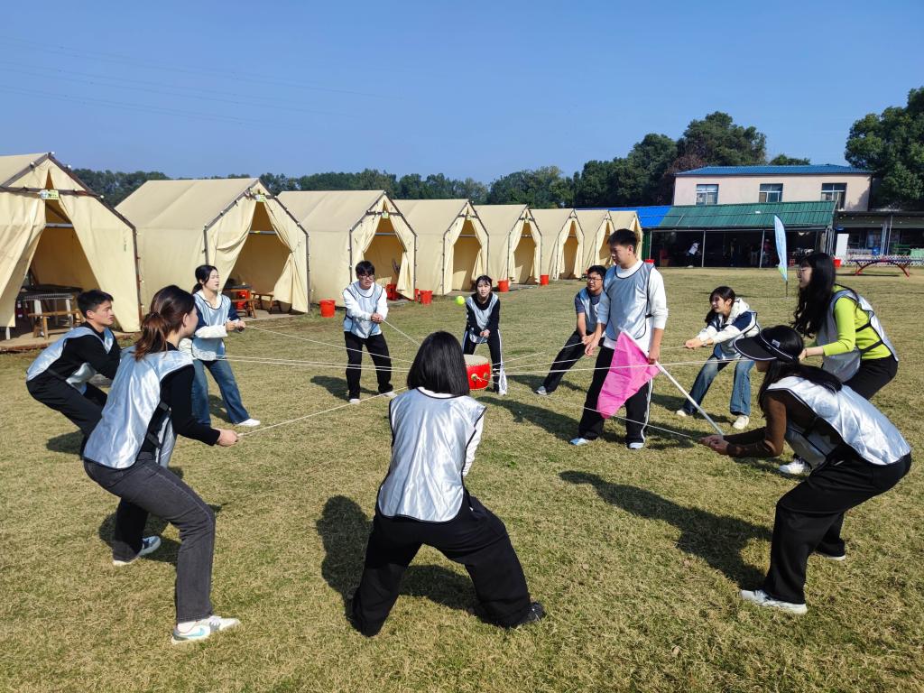 随后,一行人赴体能拓展营地开展“同心同行,健体聚力”教育实践活动。在教练团队的组织协调下,全体成员分组参与“重走长征路”和“共敲同心鼓”等团队协作项目,现场协作有序、氛围热烈。