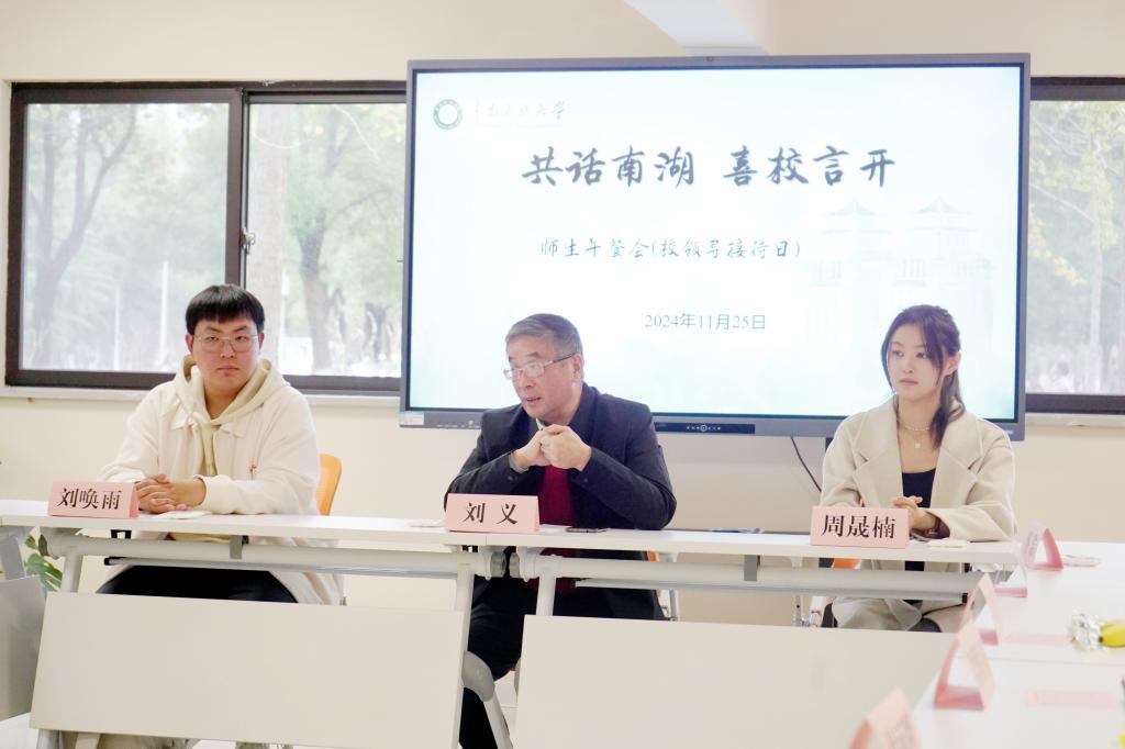 11月25日中午,我校“共话南湖,喜校言开”师生午餐会在南湖“一站式”学生社区举办。校党委副书记、校长刘义与来自不同学院的10名本硕博新生代表共聚一堂,倾心畅谈大学生涯规划和未来发展。学校党政办公室、党委学生工作部、团委、党委保卫部、教务处、研究生院、后勤保障处等多个职能部门的负责人参加了此次活动。