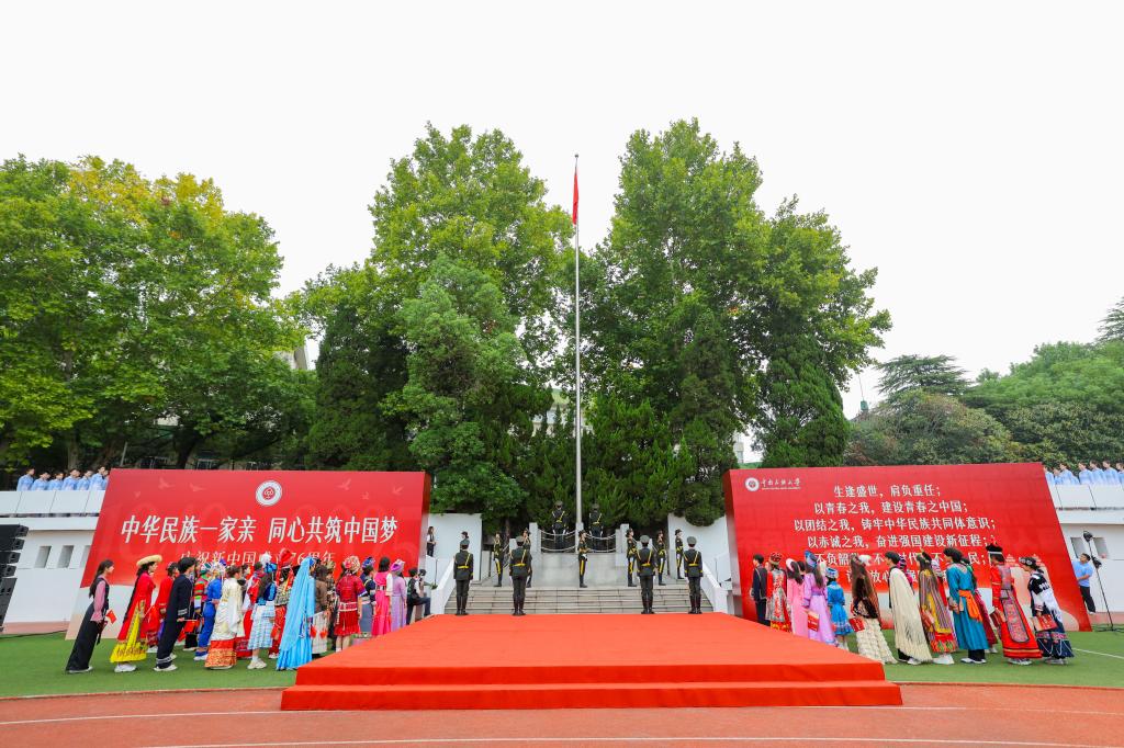 国旗仪仗队迈着整齐划一、铿锵有力的步伐护旗而出,在激昂雄壮的国歌声中,全体师生肃立注目,五星红旗冉冉升起。升旗礼毕,56个民族的学生代表共同登台,齐声朗诵《致祖国》。不同的乡音,同样的赤诚,汇聚成对伟大祖国的深情告白。“今天也是我的生日,能在国旗下与祖国母亲同庆,我倍感荣幸。我深刻感受到每个人的幸福都扎根于祖国的土壤,少年强则国强,未来我会努力提升自己,和祖国一起成长。”领诵学生代表、数学与统计学学院2022级本科生龚语笛心潮澎湃。