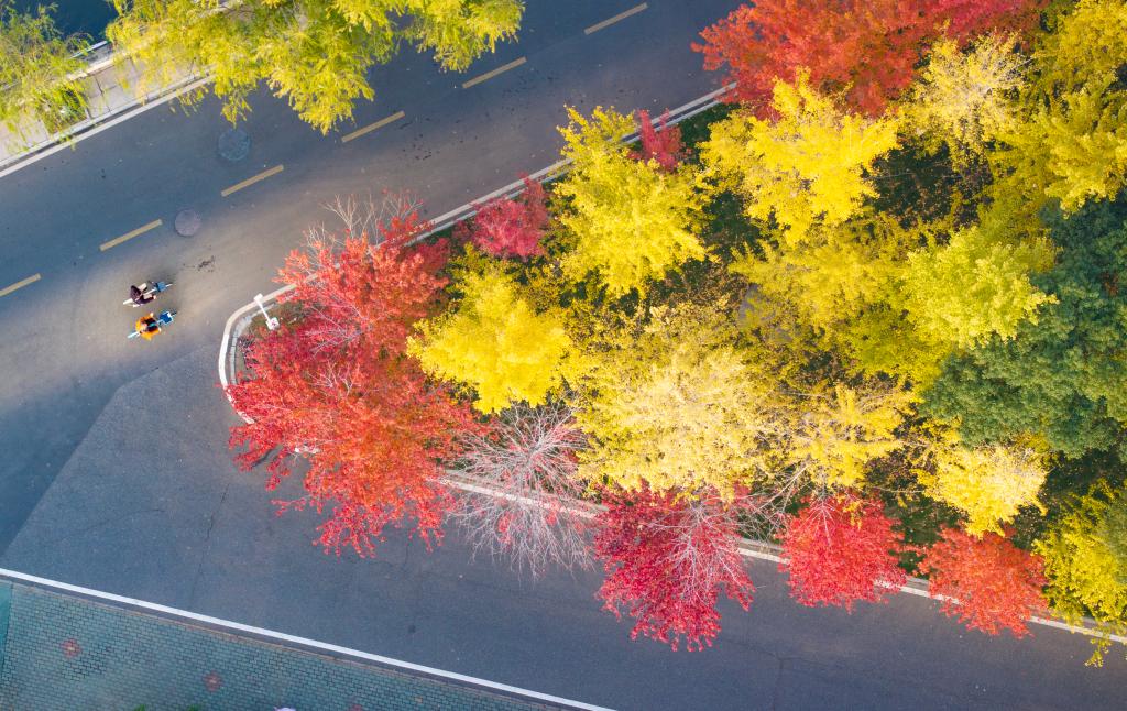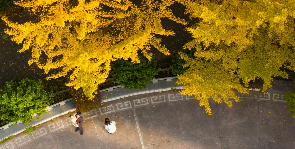 这组《秋日三叠》,是我们为秋天提交的一份层次丰富的答卷。首章,是流动的诗。高空俯瞰,红黄交织的树冠为街道披上秋衣,两名骑行者穿梭于暖柔的光影中,仿佛律动的音符,奏响了季节的交响序曲。次章,是静默的思。银杏树下,金黄浸染天地,少年独自沉浸在书页里。此刻,飘落的叶与翻动的书页私语,构成了一个内外丰盈的宁静宇宙。终章,是温暖的光。同样的金杏覆顶,成为一家人的闲适背景。怀抱的幼童、蹲下的身影,在秋景的包裹中,定格了比阳光更暖的亲情瞬间。