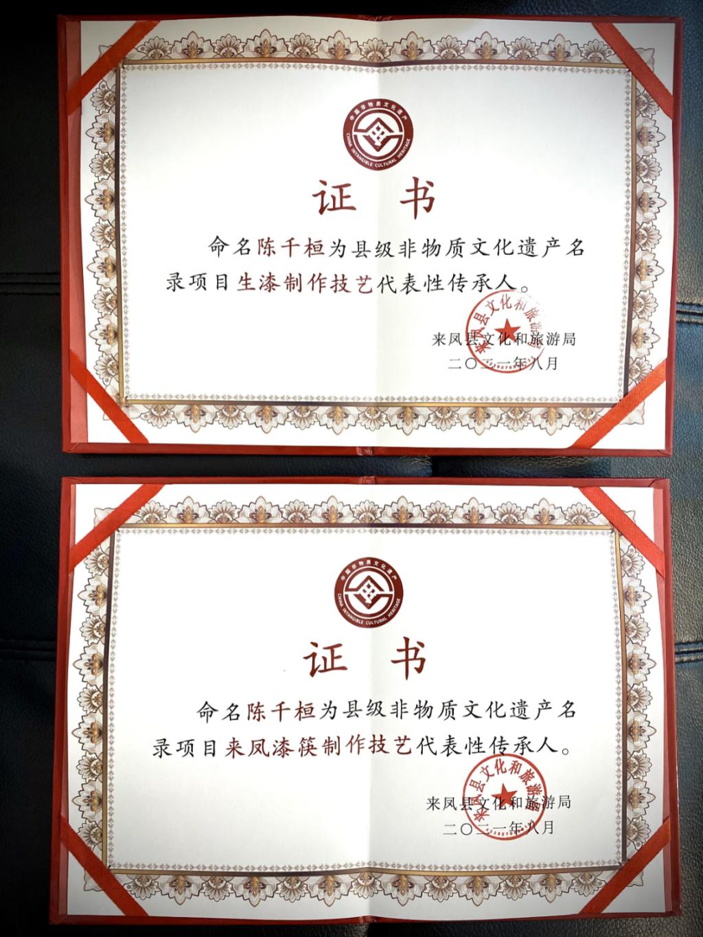 2020年,他成立湖北漆人堂文化传播有限责任公司,用更系统的方式推动漆艺产业化发展。如今,陈千桓已是来凤县“生漆制作技艺”“来凤漆筷制作技艺”和州级“漆器髹饰技艺”非遗传承人。他将恩施女儿城的施南漆艺研究所作为常驻基地,开办漆艺培训班,继续推广宣传大漆等非遗。