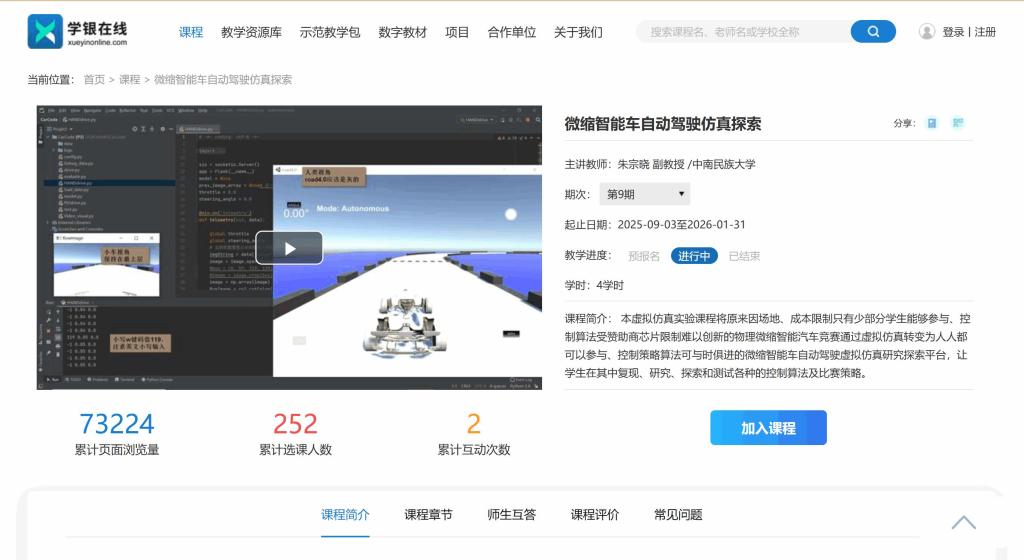 《微缩智能车自动驾驶仿真探索》虚拟仿真实验平台由中国自动化学会科普教育基地——我校计算机学院智能车实验室自主提出、设计、开发、维护与迭代,分为仿真平台、算法平台和交互式学习网站三部分。仿真平台CarLab将物理微缩智能车比赛场景1︰1还原至虚拟环境;算法平台CarCode利用人工场景便于数据采集的优势,支持手动控制、PID控制、深度学习模型训练和强化学习模型训练,结合循序渐进的教学安排,并在码云开源平台(https://gitee.com/pisc/CarCode/)提供最新代码,鼓励学员进行算法创新与竞赛;交互式学习网站(https://www.xueyinonline.com/detail/255003466)在学银在线上线,现已运行第9期(2025.9-2026.1),覆盖全国45所学校,累计互动73224次,应用成效显著。