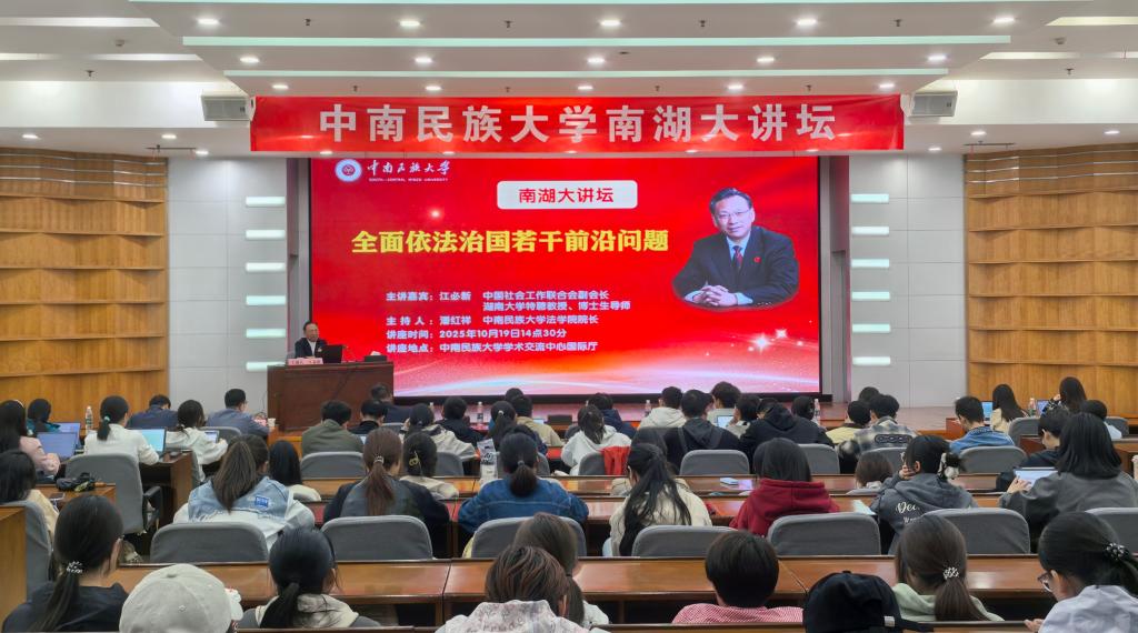 10月19日下午,我校第六十四期南湖大讲坛在学术交流中心举行。本次讲坛邀最高人民法院原党组副书记、副院长,第十三届全国人民代表大会宪法和法律委员会副主任委员,中国社会工作联合会副会长、湖南大学特聘教授、博士生导师江必新教授,作主题为“全面依法治国若干前沿问题”的学术讲座。讲座由我校法学院院长潘红祥主持,学校相关学科教师、研究生及本科生参加。