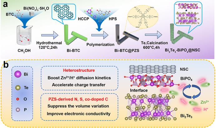 我校此项研究以溶剂热法制备了Bi-1,3,5-苯三羧酸(Bi-BTC)纳米棒,并在Bi-BTC纳米棒上成功地包覆了聚磷腈层(表示为Bi-BTC@PZS),N2气氛中高温碲化得到了N, S共掺杂的多孔碳纳米棒(Bi2Te3-BiPO4@NSC)。通过构建具有内建电场的异质结构,显著增强了电极本征电导率,且多孔结构为Zn2+传输提供了更为高效的通道,有效地缓解了动力学缓慢和结构退化的问题。实验结果和理论计算表明,异质结电极具有较低的带隙,降低了离子扩散阻力。这些调控手段使得Bi2Te3-BiPO4@NSC展现出高可逆容量(0.2 A g-1时为458.2 m Ah g-1)、卓越的倍率性能及优异的循环稳定性。通过引入BiPO4诱导Zn2+和H+的吸附能协同增强,揭示了Zn2+/H+共插层的双离子存储机理。该项研究构筑了一种新型的层状异质结阴材材料,为开发高性能、安全和稳定的锌离子电池提供了一种有前景的解决方案。