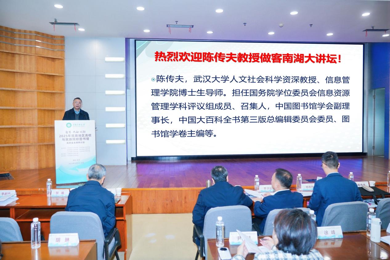 10月29日上午,由图书馆与科学研究发展院共同主办的我校第六十五期南湖大讲坛在学术交流中心举行。武汉大学人文社会科学资深教授、信息管理学院博士生导师陈传夫教授应邀来校,作题为《新型学术生态与图书馆发展》的专题学术报告。图书馆全体馆员及管理学院等单位师生代表聆听了此次报告。