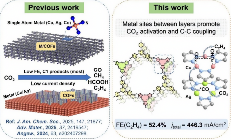 我校化学与材料科学学院张泽会教授课题组于11月27日发表了一项重要研究成果。该团队报道了一种具有精确可调Cu-Ag空间构型的双金属金属-共价有机框架(MCOF)催化剂,用于电催化CO2还原制乙烯,研究成果以“Copper-Silver Bimetallic Metal-Covalent Organic Frameworks with Unique Intermediate Interlayer Transfer Effects for Enhanced Electrocatalytic CO2to Ethylene Conversion”为题在国际知名期刊德国应用化学(Angewandte Chemie International Edition)上发表(原文链接:https://onlinelibrary.wiley.com/doi/10.1002/anie.202520496),我校张泽会教授、兰州大学董正平教授为本文共同通讯作者。