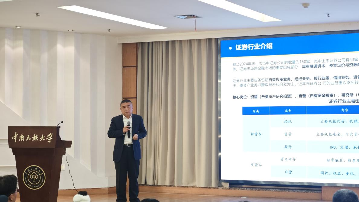 讲座中,严长胜校友以《金融行业的现状及发展》为题,结合自身丰富行业履历,带来兼具专业性与实用性的深度分享。他系统解析银行、保险、券商、资管四大核心板块功能定位,重点聚焦证券行业五大业务类型及轻重资本业务盈利模式差异,深入解读“资管新规”实施后资管行业向净值化、标准化转型的趋势,并通过最新数据展示公募基金行业规模及各类基金占比情况。同时,他结合自身从华泰证券到兴全基金的职业成长路径,分享金融行业核心竞争力要求,强调专业积淀、风险意识与长期思维的重要性,并详细介绍公募基金行业投研、市场、运营等精细化岗位职责定位,为有意向进入金融行业的学生提供了清晰的职业认知。同时分享了行业未来发展趋势,为学生揭示行业发展机遇与挑战。严长胜建议,面对未来职场,在校大学生要坚定信心、选对方向、持续努力、打牢基础,不断提升自身的核心竞争力。