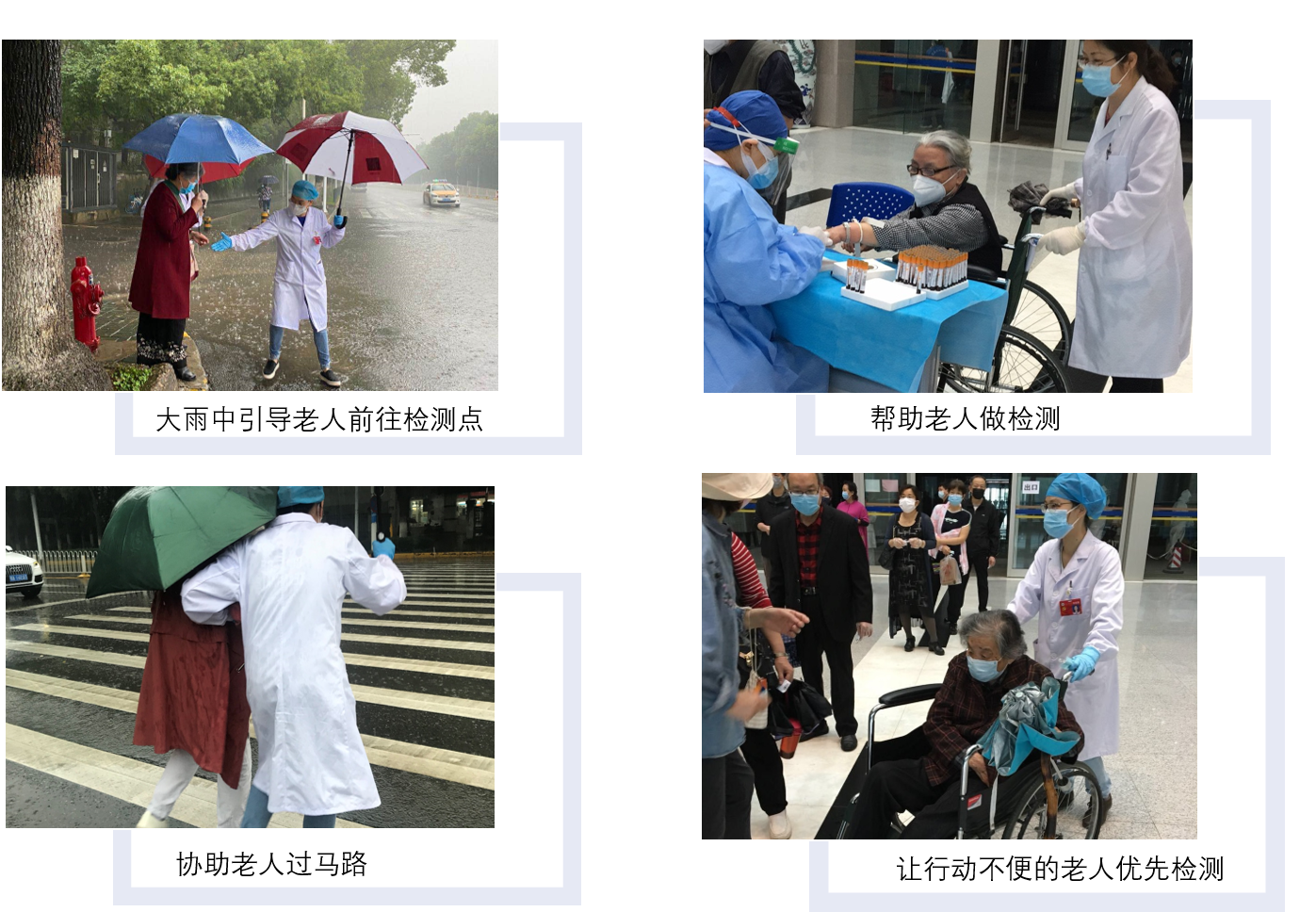 每场检测虽然人数众多,但是全部做到了规范有序,应检尽检。校医院提前对受检人群进行宣传,登记,现场引导、分流、宣教,事后及时与检测机构对接,向受检者和学校相关部门反馈检测结果。 5月14日是第四批核酸检测时间,受检群体主要是留校学生和社区离退休老人。当日上午,天空阴沉,10点左右开始下起倾盆大雨,为了方便东家属区的老年人前往校园进行检测,校医院医护人员主动到民大东家属区出入口和校门口进行接应,为老人们撑伞,协助老人过马路,搀扶行动不便的老人做检测…..这些暖心的举动感动了在场许多人。最后,在大家的共同努力下,所有检测顺利完成。