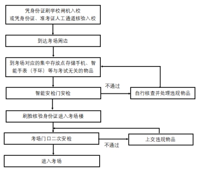 (一)为确保有充足时间完成入场程序,建议考生提前1小时以上到达学校。12月20日早上6:50开始存放个人物品,7:40开始安检(12月21日早上6:50开始存放个人物品,7:50开始安检);每天中午12:30开始存放个人物品,13:15开始安检。