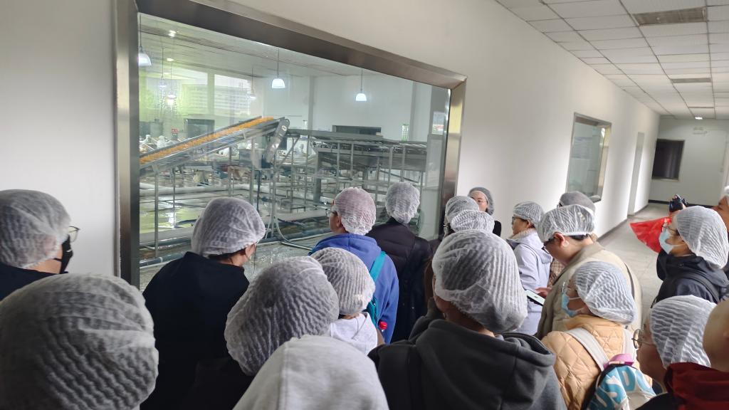 在湖北天天红食品有限公司,师生们头戴卫生帽,走进橘子罐头生产车间的参观通道。透过洁净的玻璃,自动化生产线正高效有条不紊地运转,——橘子从原料经清洗、分拣到罐装,每一道工序直观呈现食品工业化生产的严谨与高效。自动剥皮机精准去皮、智能分瓣机高效分拣,多级水质净化系统的稳定运转,不仅提升了生产效率,更确保了产品品质的稳定性,让同学们对食品工业化生产有了直观而深刻的认识。